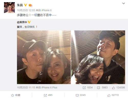 黄贯中昨日在微博上紧搂朱茵的甜蜜合照,并亲昵写下“宝贝,生日快乐”。照片中,夫妻俩头靠头紧紧相偎在一起,尤其朱茵一脸灿笑,幸福之情溢于言表。