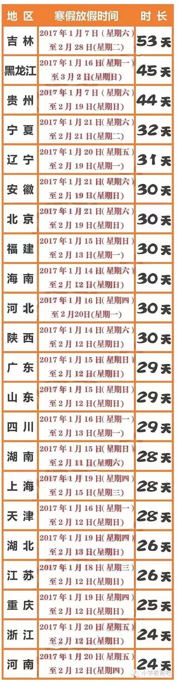 2017年全国小学生寒假放假时间表出炉